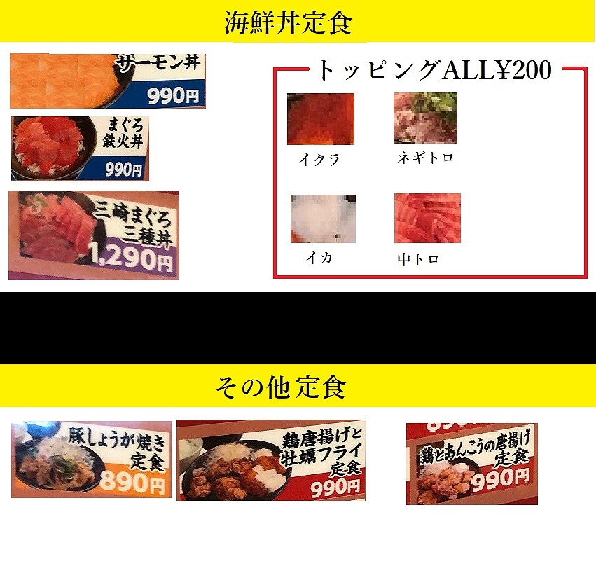 いったん豚生姜焼きはさんで、海鮮丼ぶり。で唐揚げ定食。